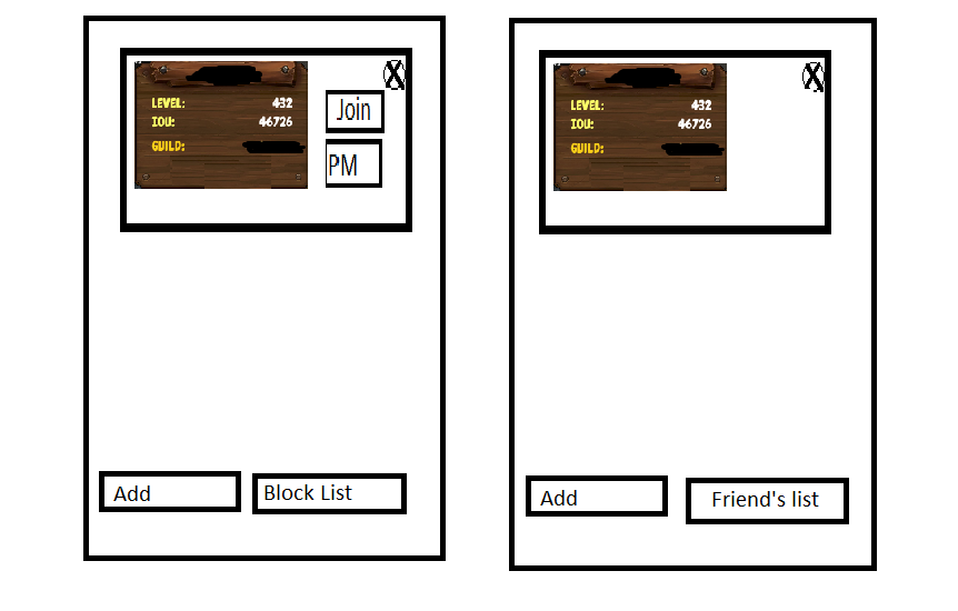 The idea isn't that original but i don't remember seeing it here, a friends list, and might as well add a block list for chat, the x is to remove the person from the list they're in, pm is whisper and join is to join their party which i guess would be the main thing you'd use fl for, to make it easier to join people outside the guild. Maybe there could be some more info added on the character, like their pets, dps, level and things like that which might be relevant. Also added an option to add person to 1 of the 2 lists from chat by clicking the person's name.