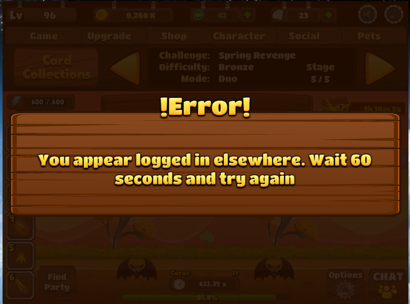 I'm trying to be as patient as I can, but this is seriously getting infuriating. It seems I'm spending 1/2 my time logging in, or checking the game to see whether it's kicked me out of my party without telling me, or for some reason, telling me I'm "already logged in" when I haven't done anything, and have only played in 1 Chrome tab.