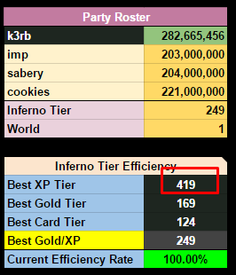 After cell B241, inferno levels are skipped and as a result, Inferno Tier Efficiency cells (S11:S15) aren't accurate.  For example: